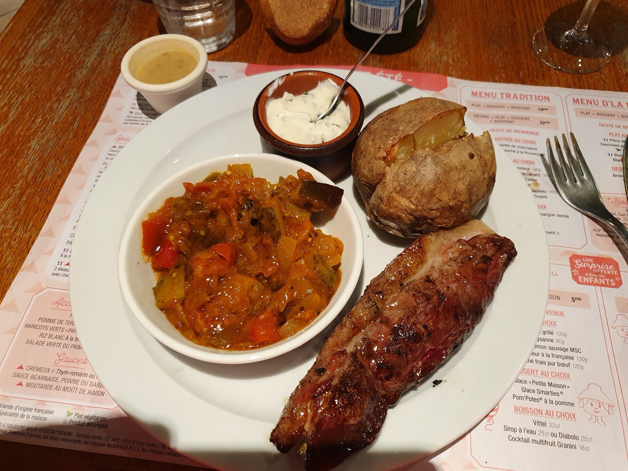 Le pain est chaud et l’eau est fraiche. Hormis ça pas grand chose d’autre à dire, une cuisson de viande à revoir (steak demandé bleu reçu cru) Une brioche façon pain perdu étant juste une brioche avec accompagnement… À revoir …