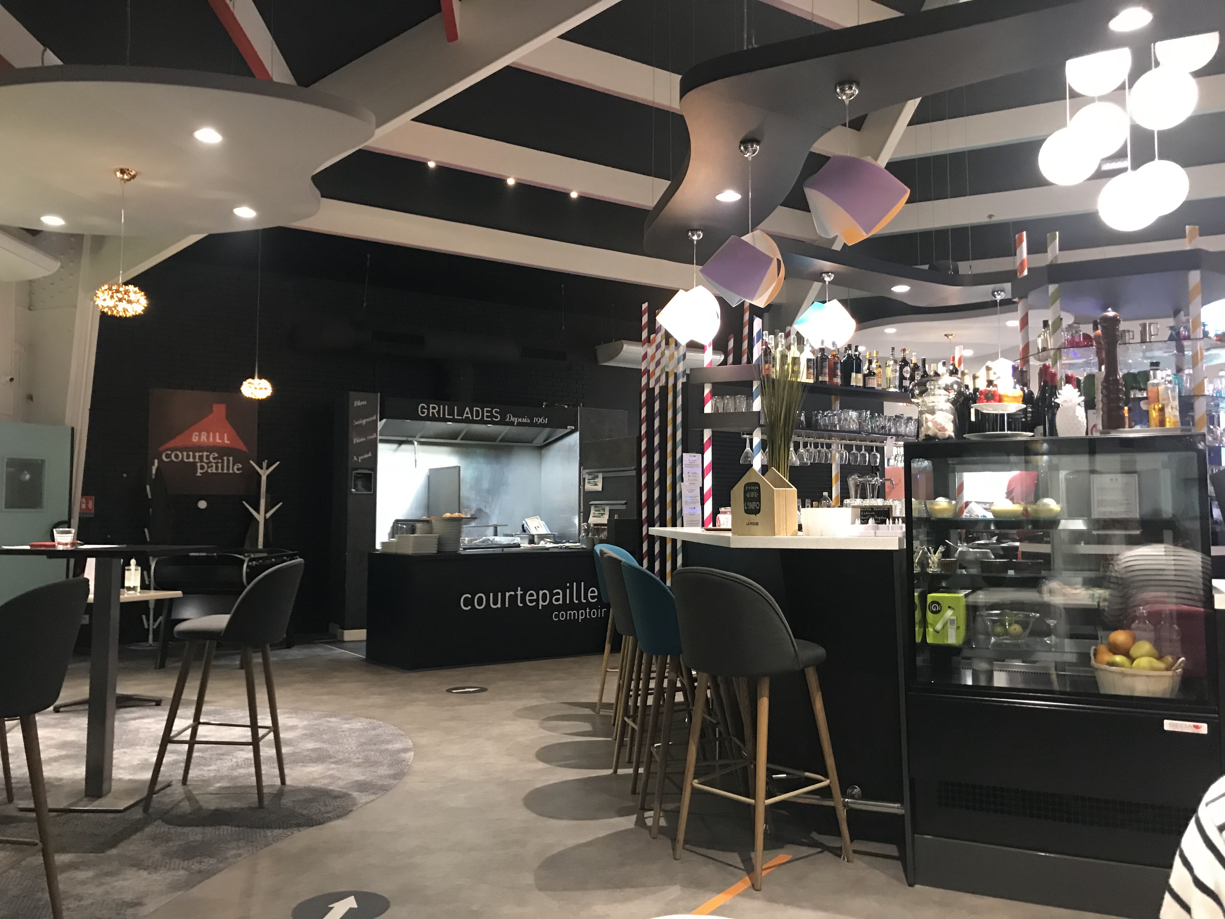 Bonjour MR PEVEL Notre restaurant au sein de l hôtel est un COMPTOIR COURTE PAILLE , donc une carte plus restreinte et une salle plus petite aussi mais décorée au thème de l hôtel sur le bonbon . Nous sommes désolés que notre nouvelle carte et nos prestations ne vous aient pas convaincu. La directrice MME Rageul