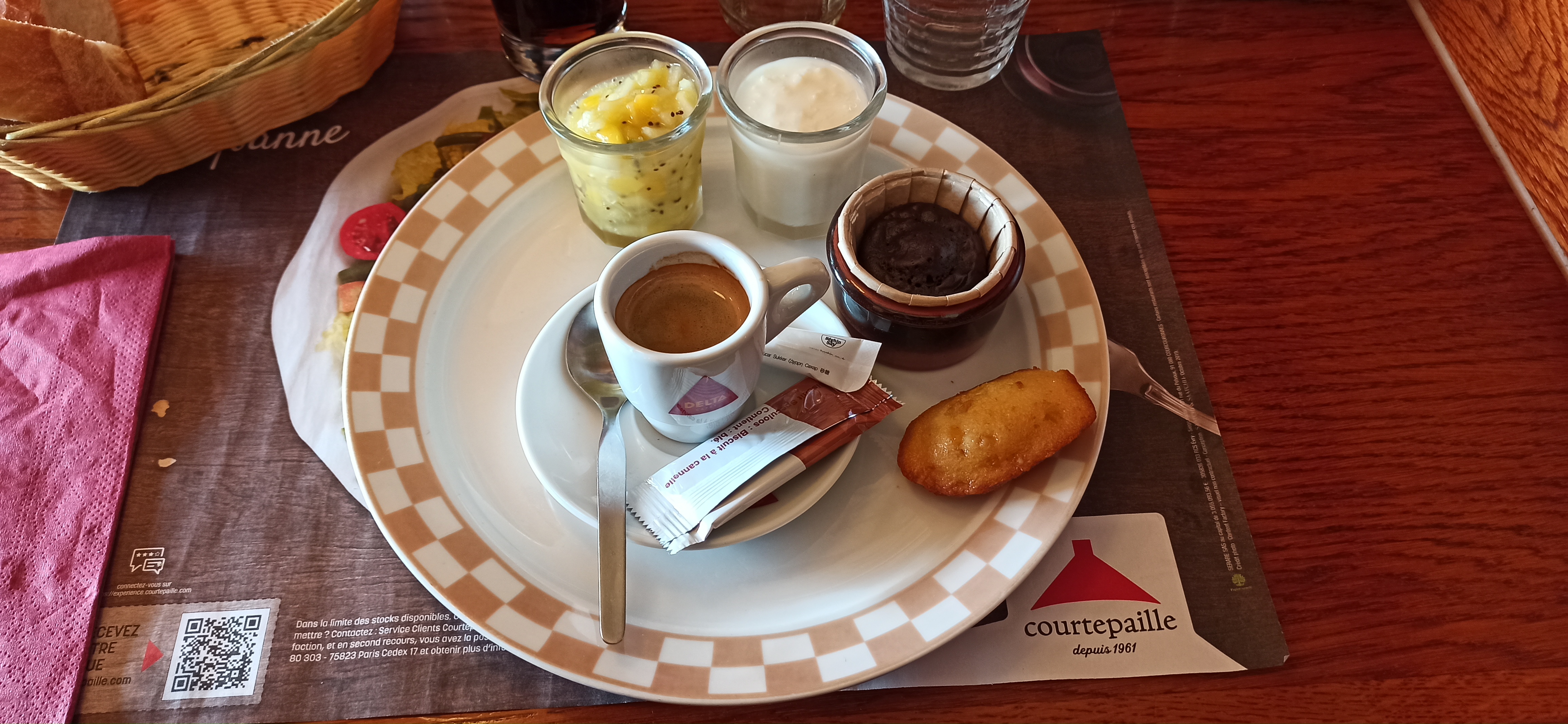 Posté le 11/02/2024 à 08:09"Une salade de bienvenue ! (3 feuilles de salade avec une vinaigrette industrielle et du 3 morceaux de pain ) Un jarret confits bon mais, au naturel pas de sel pas de poivre ,accompagnement choux de choucroute cuit a l'eau sans sel sans gout sauf celui du choux ,présenté dans une assiette blanche aucune déco , pas de plaisir visuel ! Dessert banana split , saturé de chantilly en bombe , ambiance vide ! Personel très aimable mais apparemment débutants ! Nous ont proposé un apéritif mais pas de quoi boire au repas , même pas d'eau plate ! Un café delta court comme j'aime, mais seulement 2 cm d'eau. Bref je connaissais pas ,maintenant oui !"