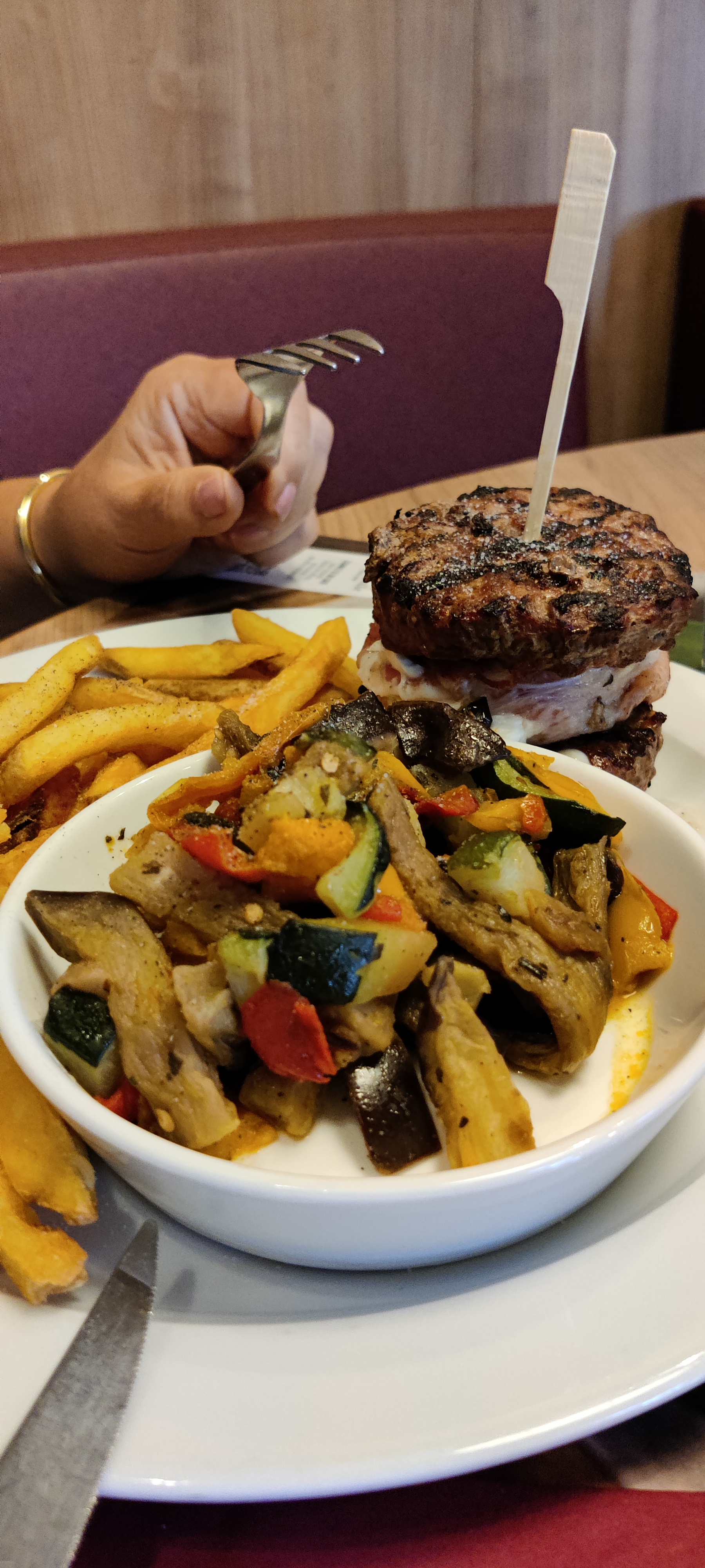 Posté le 02/10/2023 à 12:09"Légumes sans saveur. Pomme de terre sèches sans gout. J'ai pris le burger double steak. Il était composé d'une tranche de tomate, deux pauvres steak et une tranche d'emmentale à peine fondue. Le pain sec premier prix tartiné de ketchup. Bref horrible. Heureusement le serveur est très sympatique et disponible. Malgré tout 45mn d'attente avant d'être servis...."