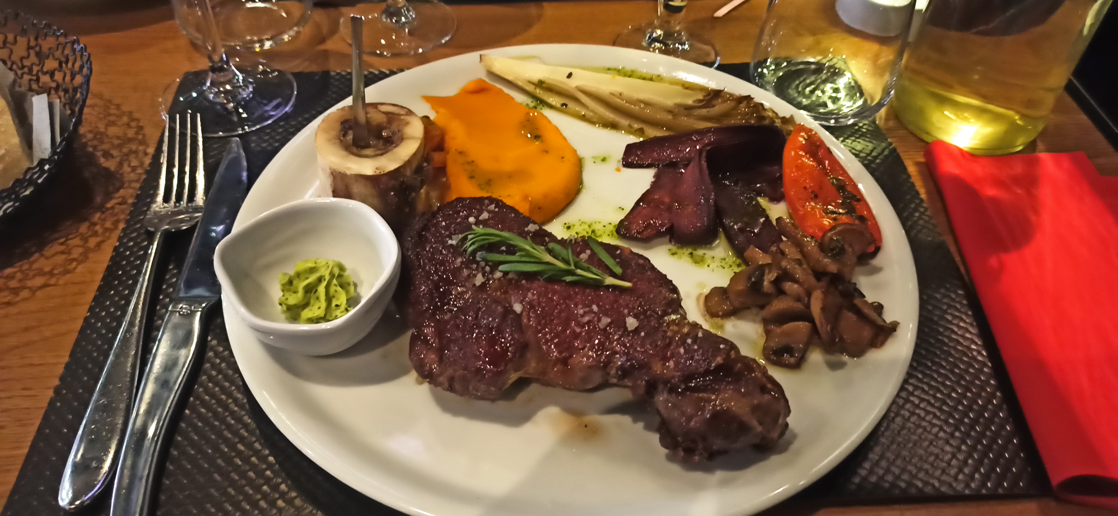 "Une viande au top!Ce n'est pas donné mais on paie clairement pour une viande de qualité maturée et cuite au feu de bois. Niveau accompagnements: frites bio fraîche ou spaetzles maison et légumes. Bel accueil. Simple, efficace et excellent!"