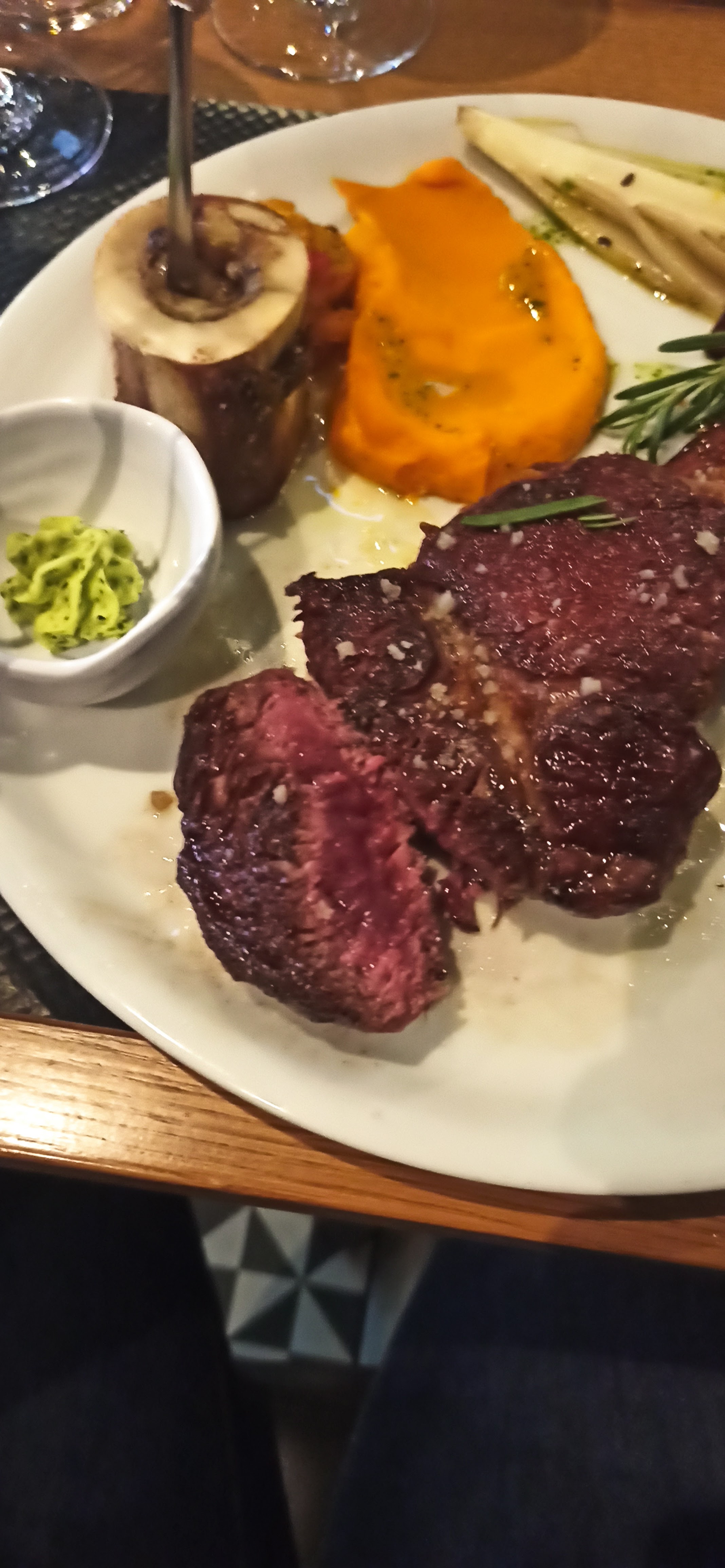 Posté le 24/02/2023 à 08:36"De bons conseils pour la sélection des viandes maturées avec adaptation du service pour optimiser la dégustation dont pour une expérience morceau japonais avant une excellente côte de boeuf cuite au feu de bois, sans oublier les os à moelle et les légumes ! Le tout accompagné d'un Lalande Pomerol excellent. C'est sûr c'est cher (133 €/Personne) mais pour les amateurs de viande maturée accompagnée d'un bon vin, je recommande"