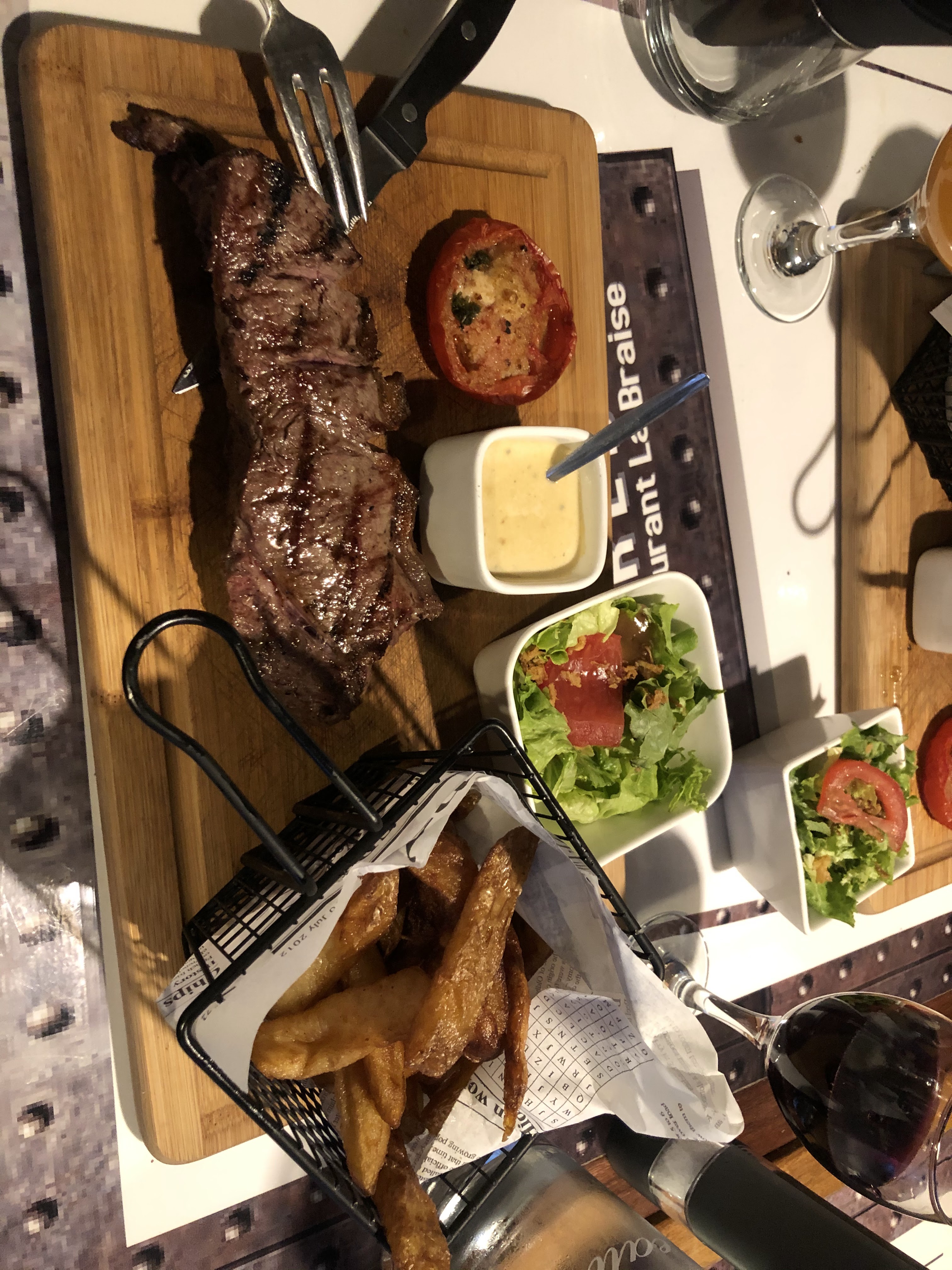 Qualité de la viande superbe mais beaucoup trop copieux pour toute la tablée! Assez de viande pour 2 dans chaque assiette. Du coup, pas de place pour un dessert ou un café. J'aurais aussi apprécié avoir le choix dans les accompagnements: quelques légumes grillés plutôt que seulement des frites.