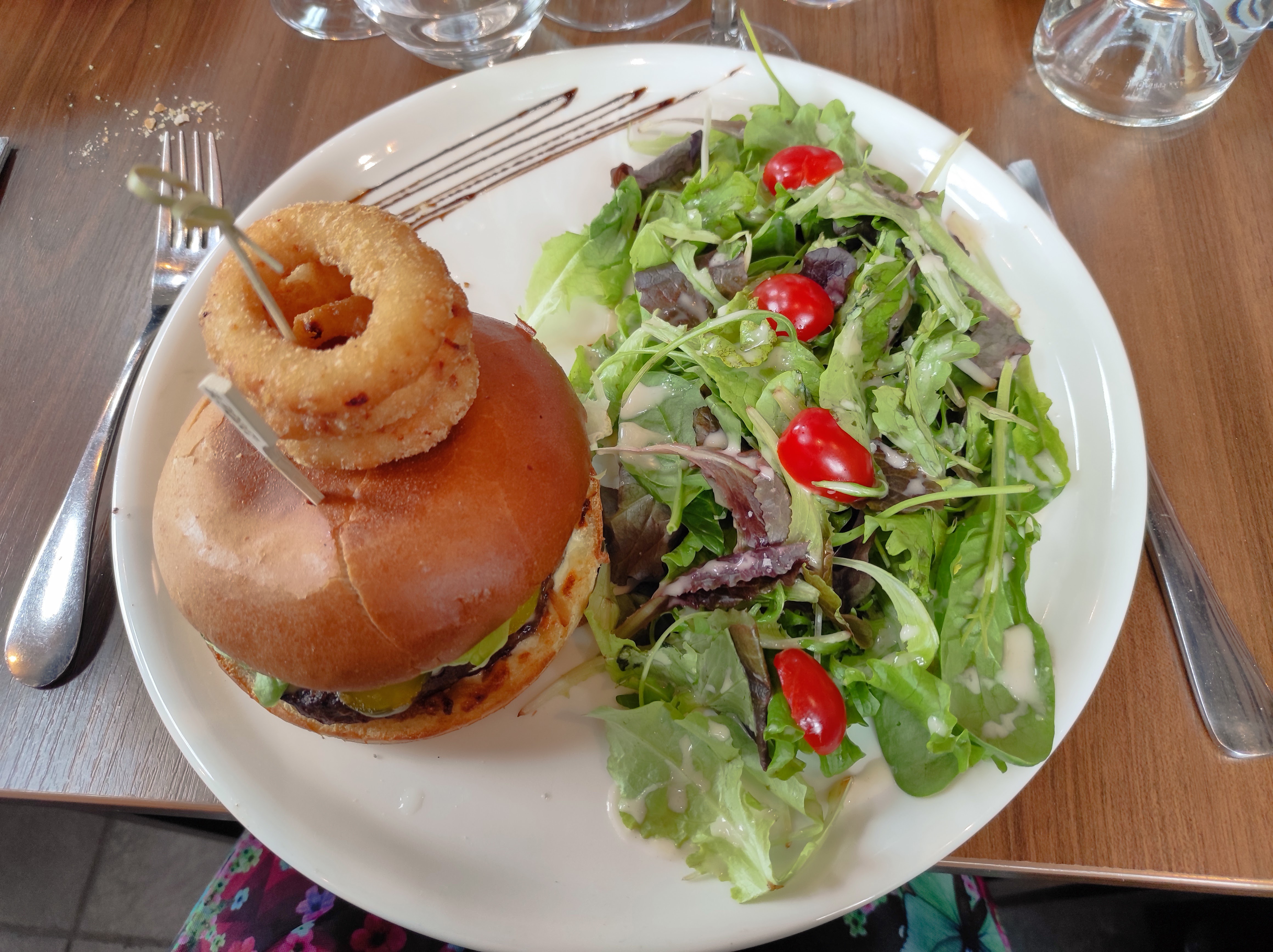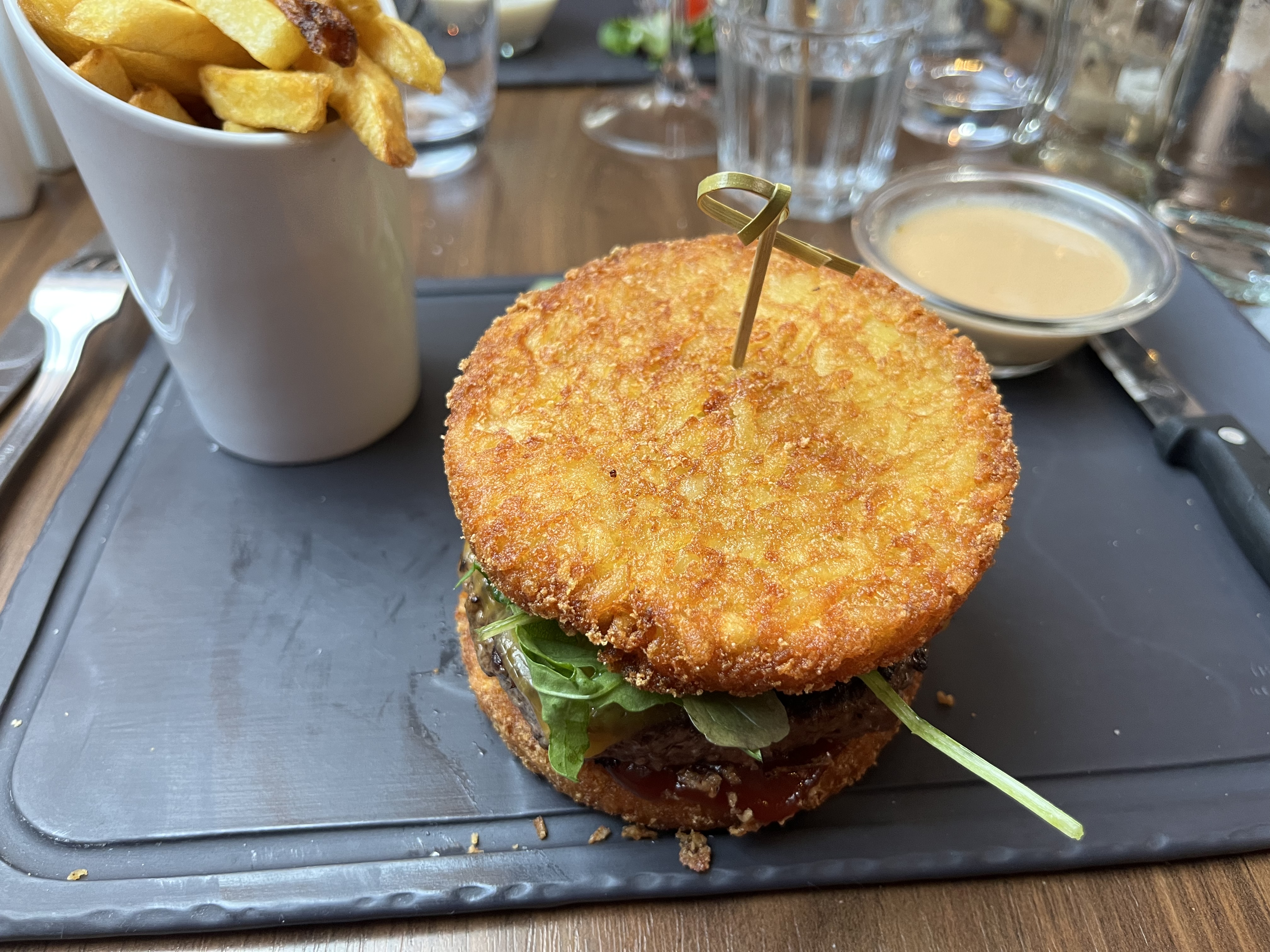 Le personnel était très sympathique et nous avons eu la chance d'avoir une table pour 2 sans réservation ! Nous avons pris le hamburger végétarien et le steak-frites. Les deux étaient des portions généreuses et savoureuses. Les desserts étaient très coquins avec beaucoup de crème chantilly ! Un vrai régal.