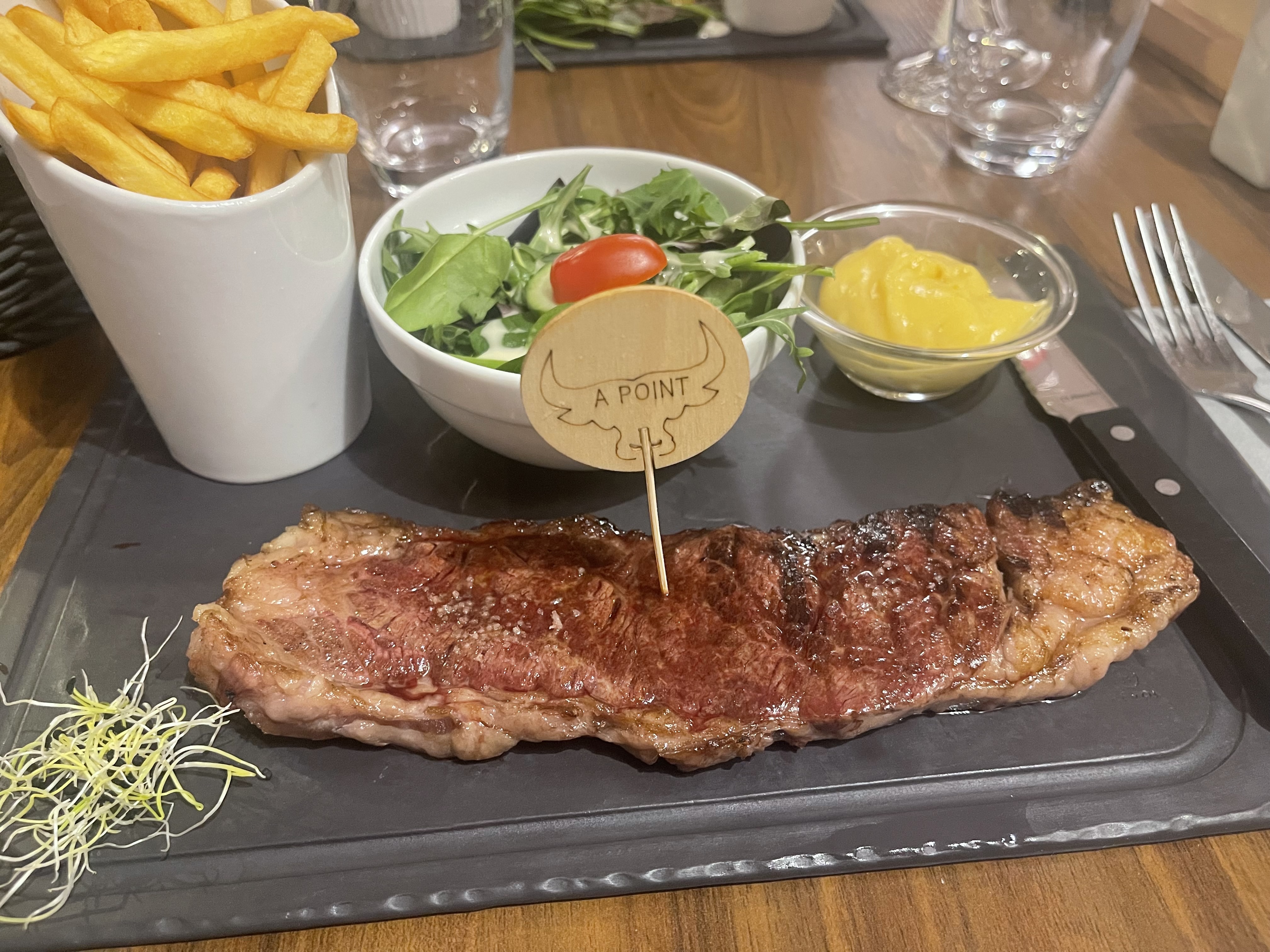 Accueil super sympa ! PMR et placé à une bonne table centrale. Le kyr façon traditionnelle annonce la couleur. Ca devrait être Bon... En fait, ca a été juste une tuerie culinaire. La noix d'entrecôte Angus est sans doute la meilleure que l'on a jamais dégusté. Et pas besoin d'accompagnement avec une viande pareille tellement elle est délicieuse ! ( Bon on a quand même gouté la mayo maison et les frites ;) Les viandes grillées sont cuites sous vos yeux ( au rez de chaussée). Personnel réactif souriant et sympa ! On reviendra !!