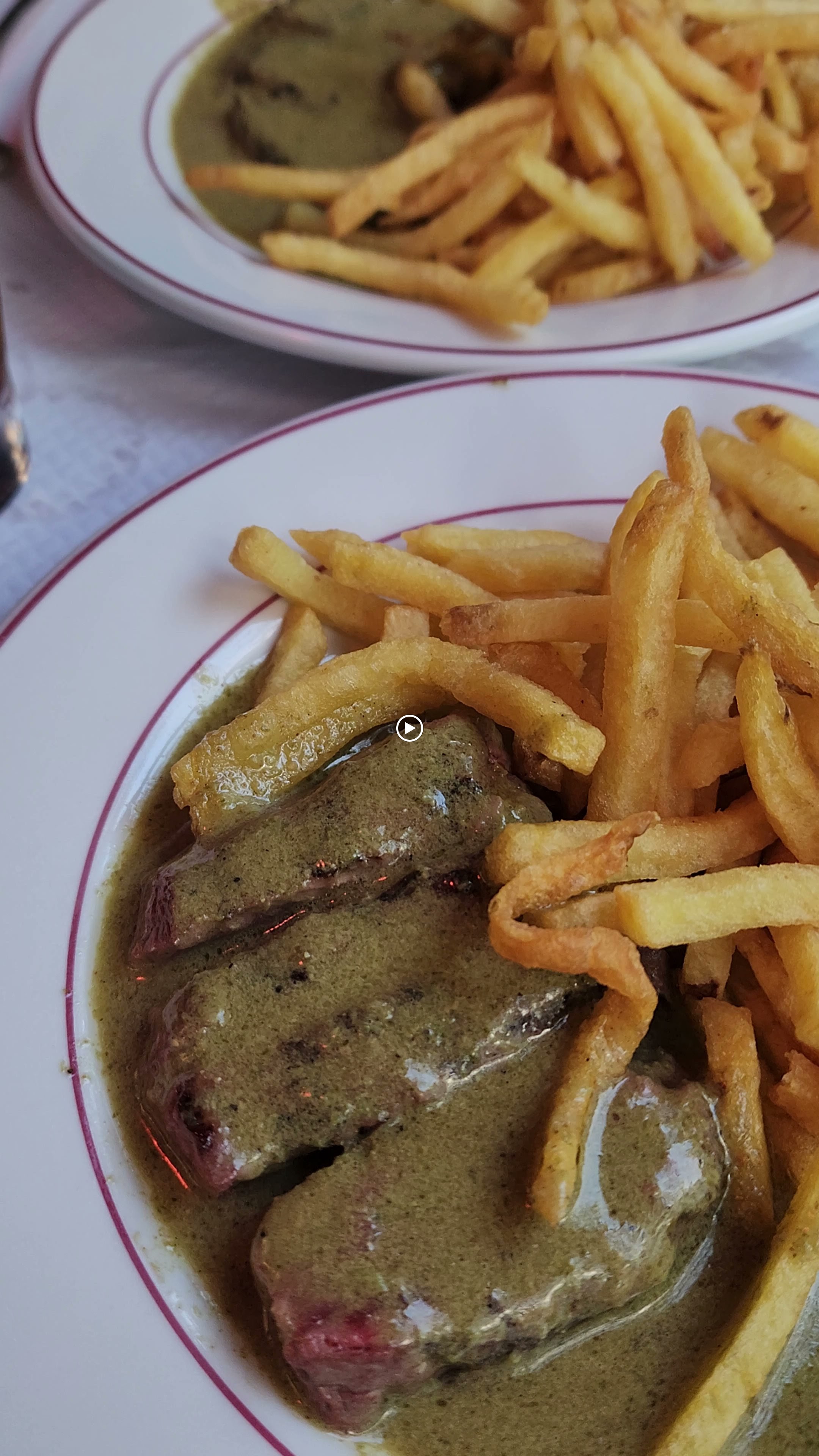 Posté le 13/09/2024 à 21:26"Concept : plat unique entrecôte avec sauce secrète / frite / petite salade en entrée. Ok et on vous sert deux fois le plat principale… donc quantité ok ! Bon la viande est excellente, très tendre, rien à dire et la sauce secrète est surprenant mais très bonne (sauce verte, j’aurai dit avec du cresson). Par contre les frites, aïe aïe aïe… elles sont de type macdo, très fines, et en plus un peu trop cuite donc très sèches… franchement, là il y a nettement mieux à faire… ça tue un peu car je m’attendais à nettement mieux pour un plat unique. Sinon le prix ça chatouille un peu 29€ surtout vu la qualité des frites… Service impeccable et souriant. Avec des VRAIES frites cela mérite 4 et avec un prix plus raisonnable, cela mérite 5 😂"