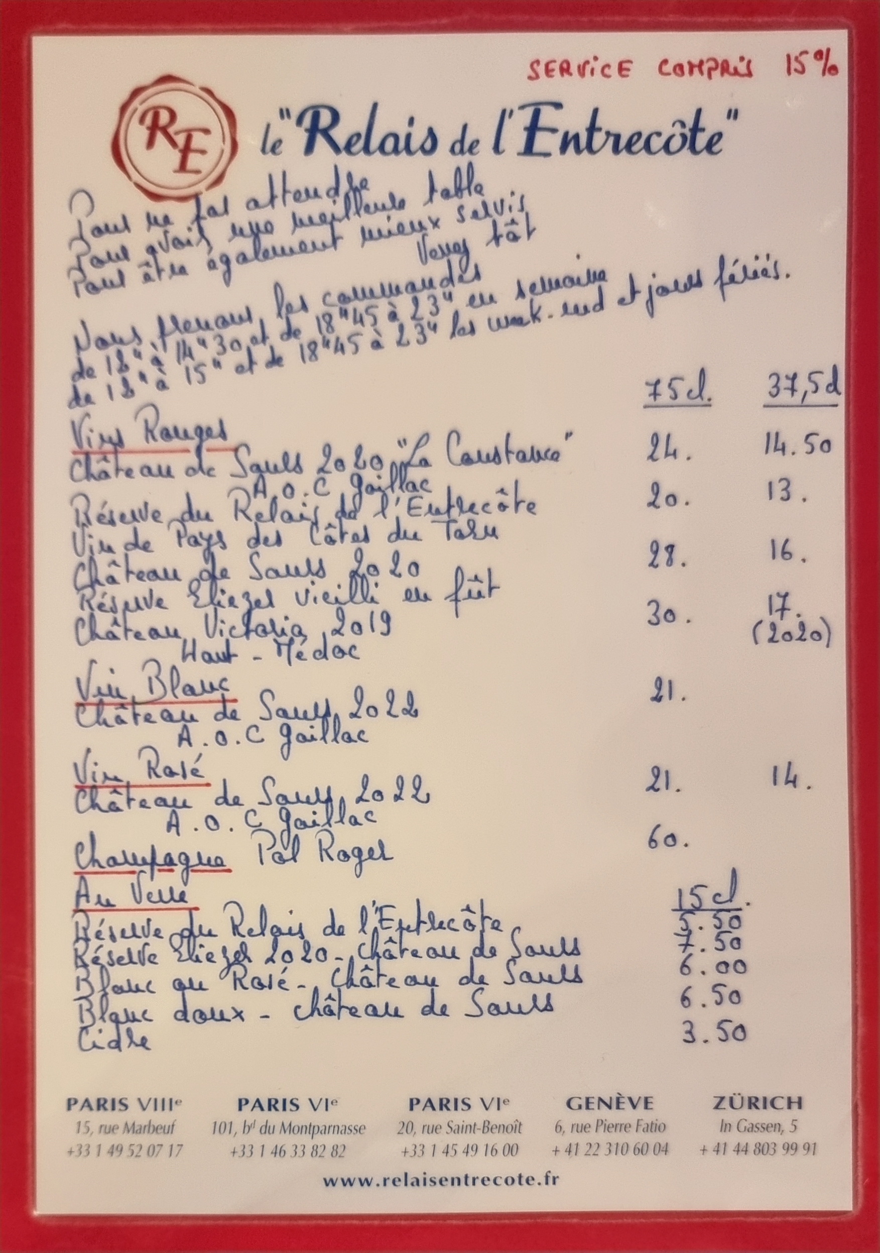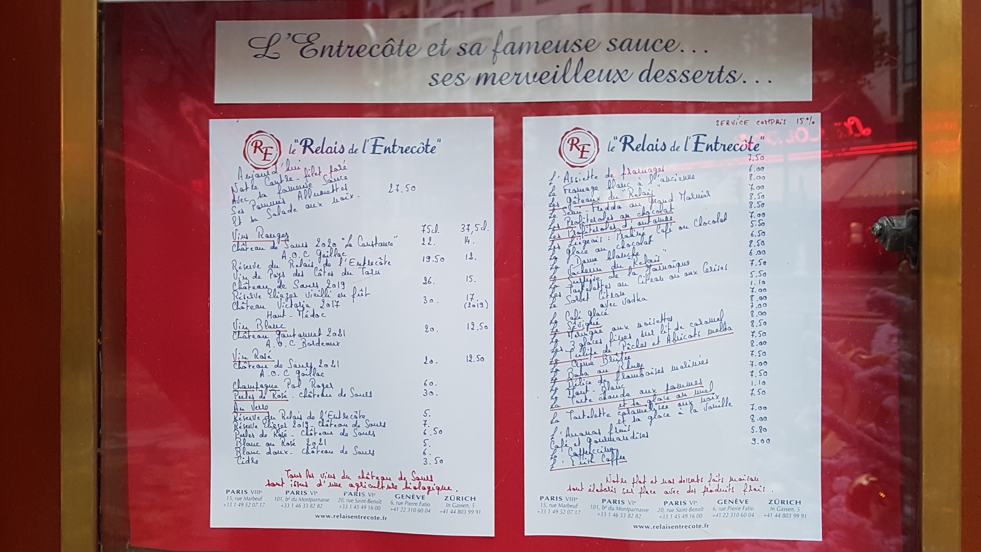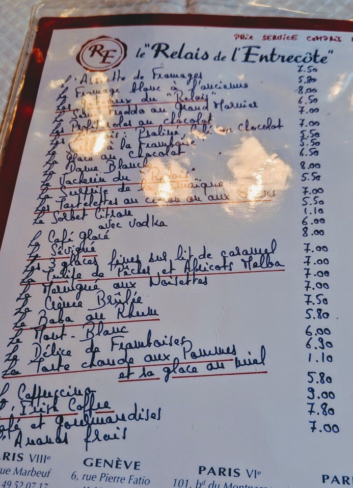 Posté le 16/03/2022 à 23:20"Une institution que nous fréquentons depuis longtemps. Toujours un plaisir, un monde fou, de nombreux touristes et une équipe formidable. Rapide, excellent, gentil, accueillant, parfait. Menu unique parfaitement maîtrisé. Frites excellentes, viande et sauce secrète . Même les enfants et les jeunes en raffolent. Desserts énormes. Bons vins le tout avec jolie nappe et serviettes en tissu. Bref prix qualité imbattable avec en plus des adorables sommelières."