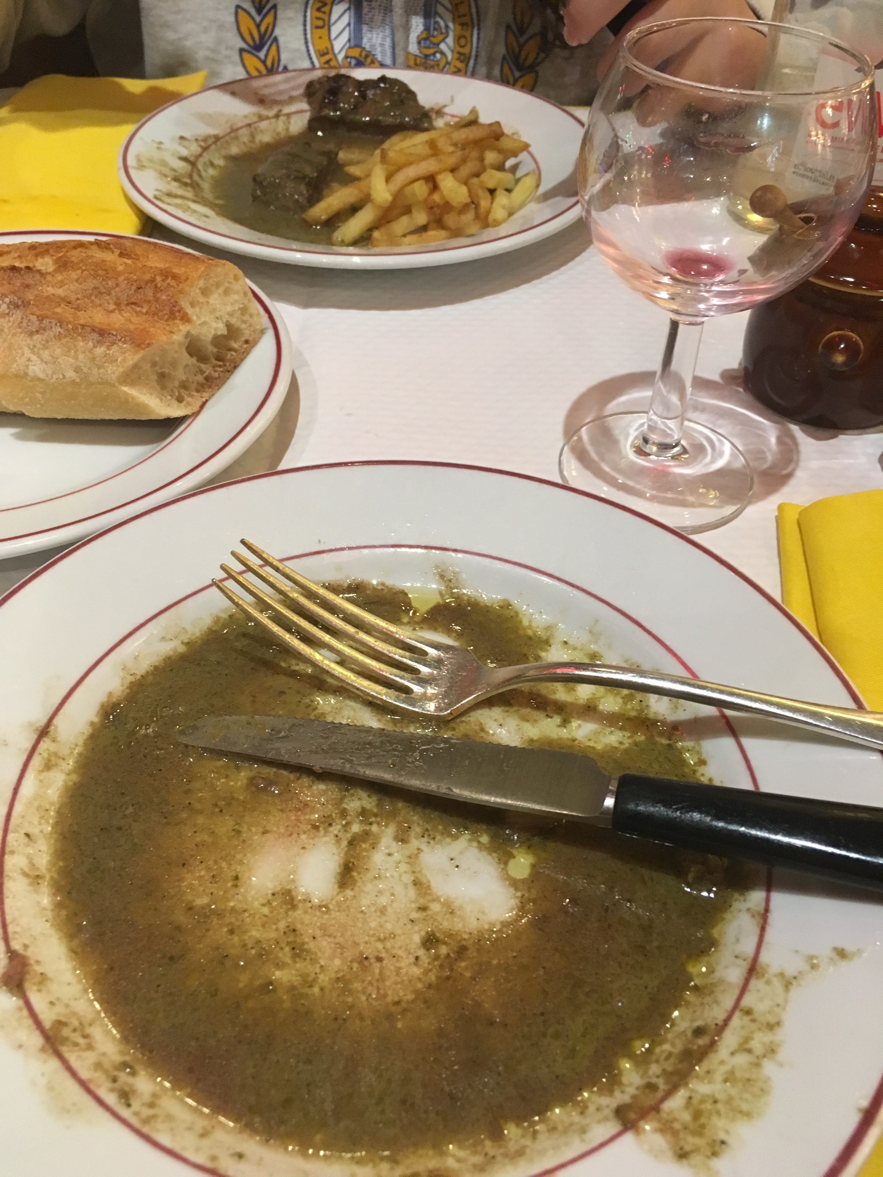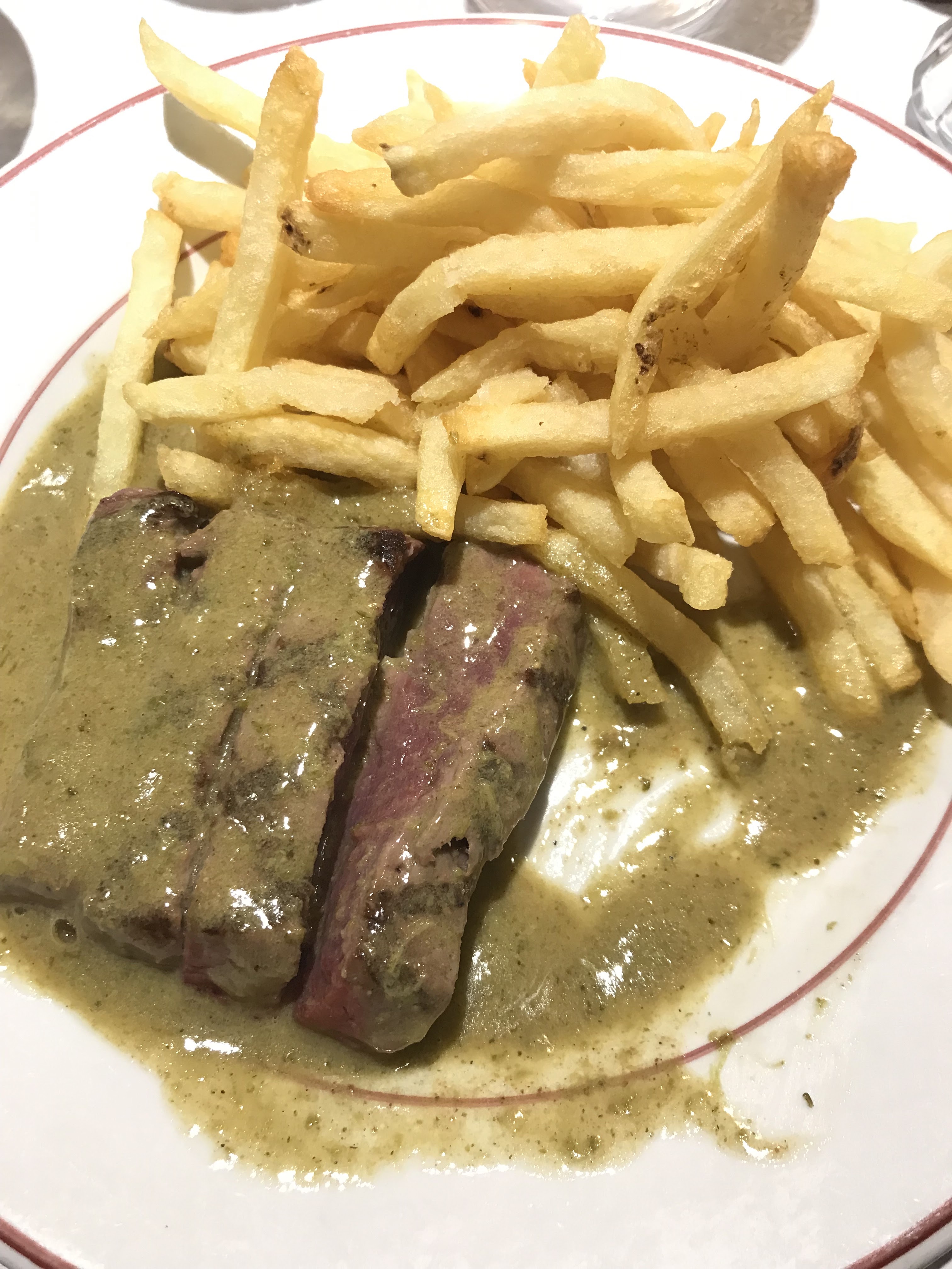 Posté le 22/01/2022 à 07:37"😐 [Un peu surcôté] Adresse légendaire, mais symptomatique des restos français trop chers pour ce qu'ils sont. J'adhère au concept de plat unique, mais j'attends qu'en contrepartie, ça soit bien exécuté. Dans les faits, c'est un service façon cantine, en 2 fois. Serveuses pas hyper accueillantes ni serviables, très hâtives. Ça ne m'a malheureusement pas donné envie de dépenser davantage pour les desserts. La quantité semble calibrée pour que vous puissiez manger les desserts (très gourmands), donc si vous vous contentez du plat, vous resterez sur votre faim. Entrecôte 😐 | La viande est tendre mais la cuisson n'est pas respectée. Elle a ni de croûte croustillante ni le goût du grill, et elle est noyée dans leur sauce maison, qui est pas mauvaise mais c'est pas la sauce incroyable à en devenir addict qu'on m'avait vendue. Pour les curieux, c'est une sauce très salée au beurre et aux herbes, avec du foie de volaille qui ajoute une pointe d'amertume et de profondeur, un goût terroir (un peu ce que serait le cidre brut par rapport au cidre doux). 💶 28,50 € Frites 👍 | Les frites allumettes sont bonnes et très croustillantes pour des allumettes. Salade 😐 | Baigne un peu dans sa vinaigrette, garnie de noix, et servie sans présentation. Très ordinaire. Budget : ~40 €"