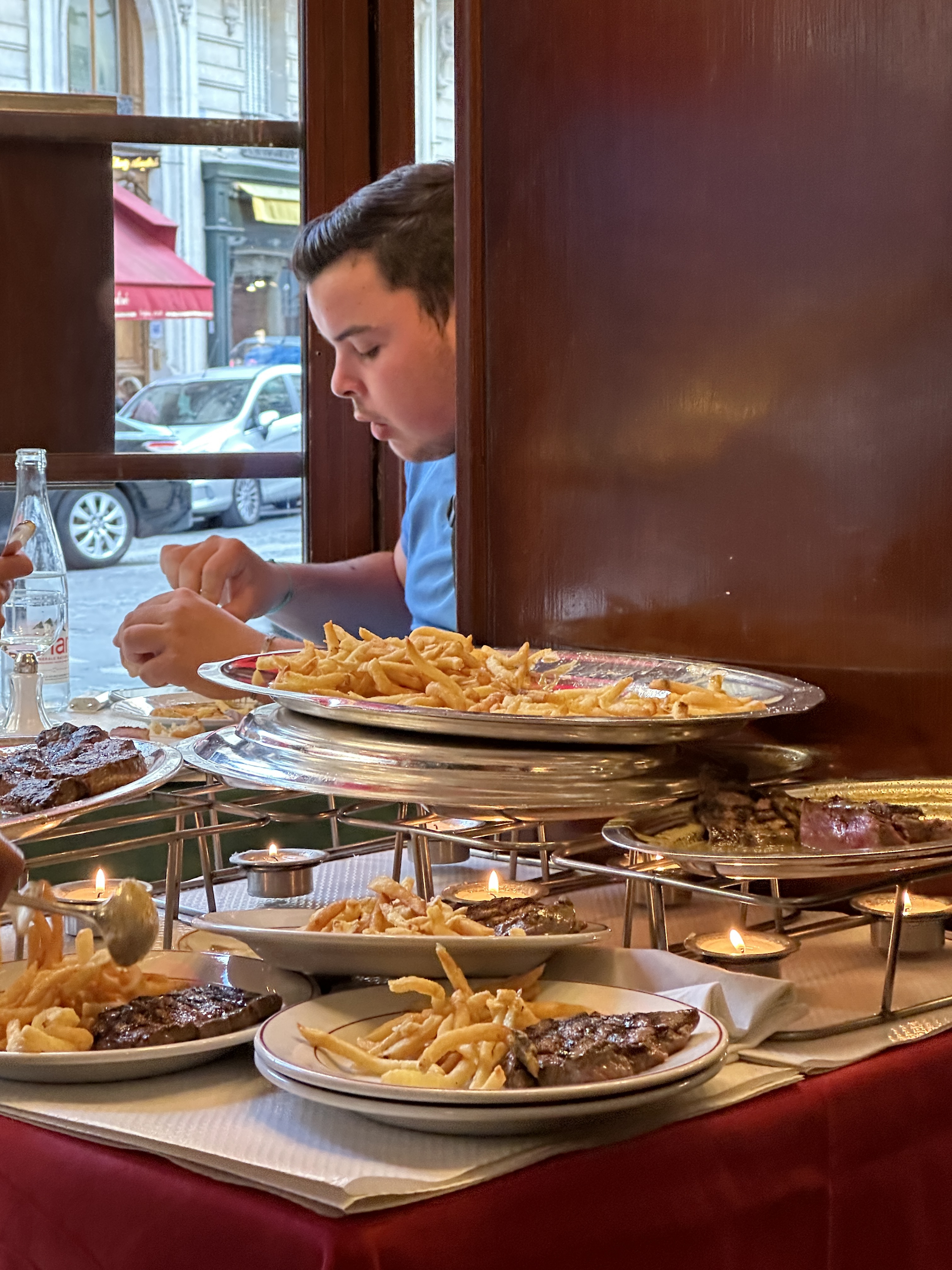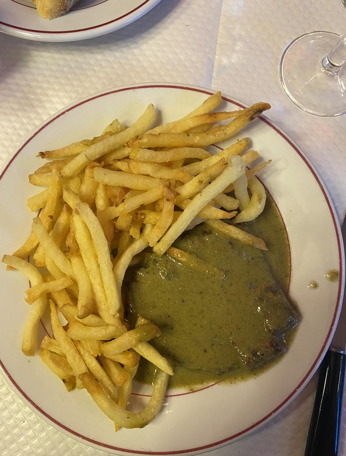 J'avais quelques attentes sur ce restaurant, l'un des meilleurs de Paris dit-on, un menu unique mais incontournable, tellement réputé qu'il y a de l'attente pour manger, et finalement, je suis pas complètement ravie. La nourriture copieuse (deux services de frites et de viande) est bonne, mais pas exceptionnelle. À part ça, le service est vraiment amical et serviable, rien à redire dessus. J'y suis allée une fois mais je suis pas prête d'y retourner, surtout si il y a de l'attente.