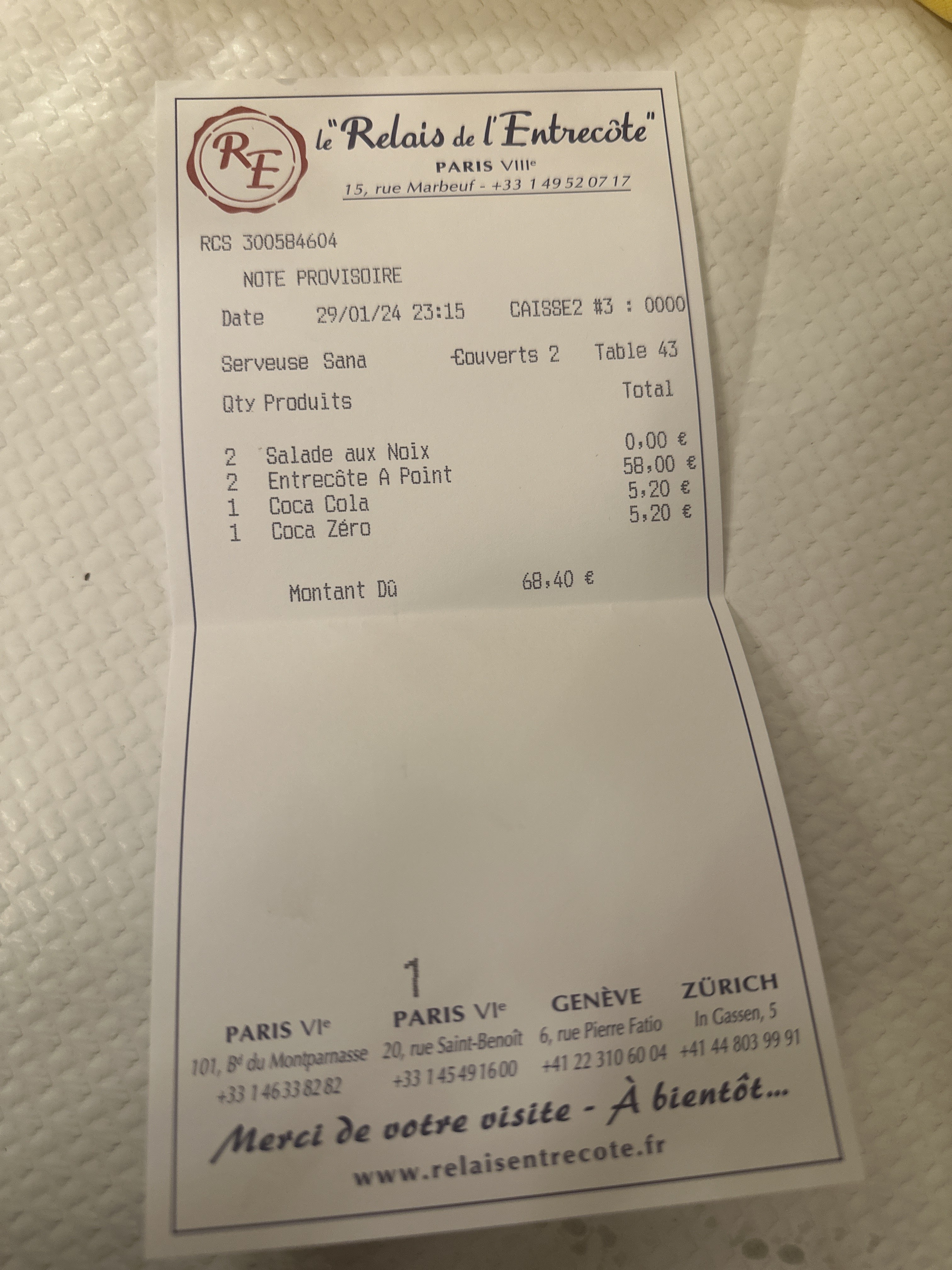 On sait à quoi s'attendre quand on va au relais de l'entrecôte. Une petite salade aux noix en entrée avec une bonne entrecôte, frites maison et sauce secrète en plat. De plus, nous avons été reçu chaleureusement malgré notre arrivée tardive vers 23h en fin de service. Merci pour tout :)