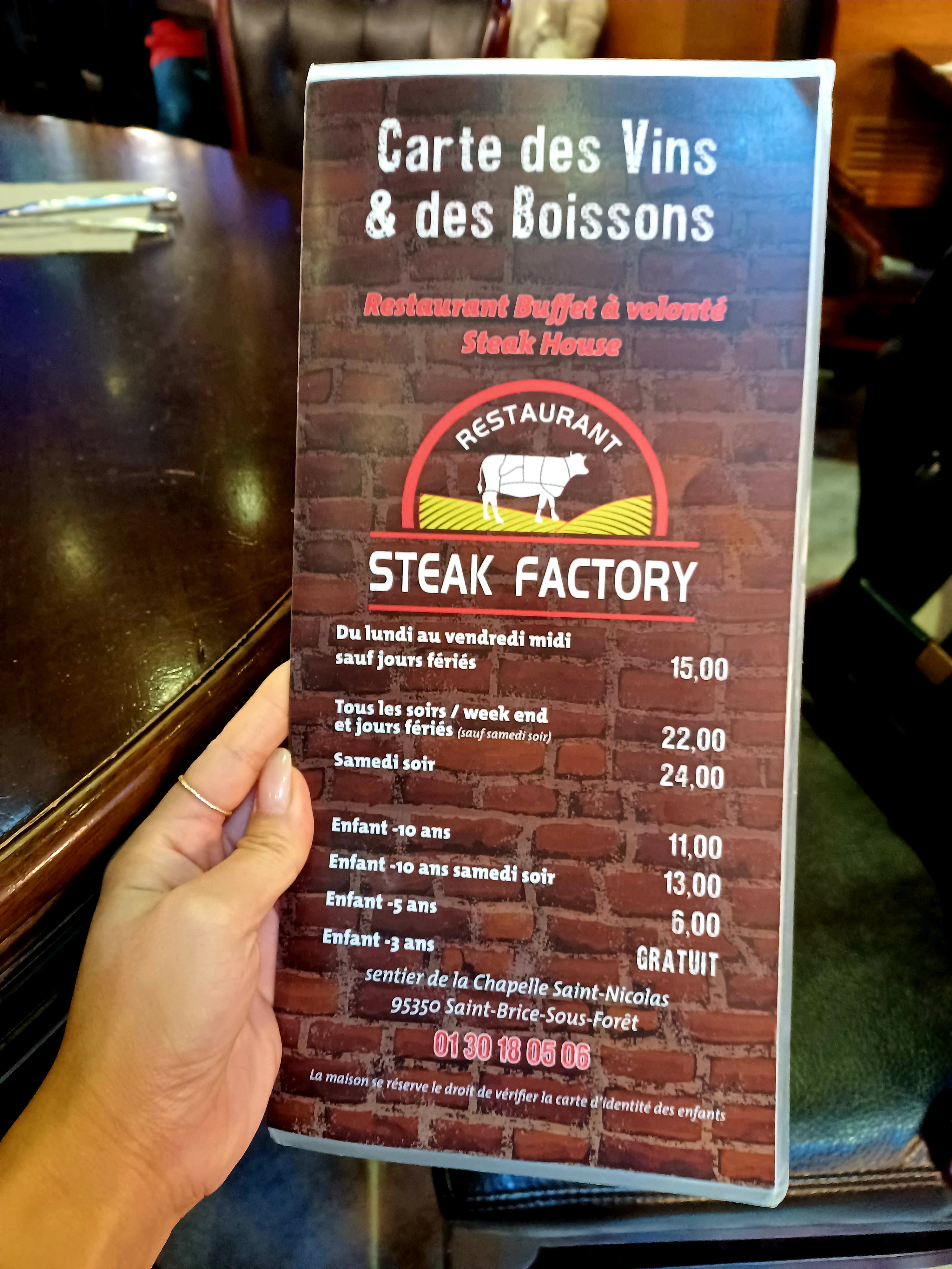 Posté le 20/02/2022 à 11:01"Steak Factory propose un buffet à volonté pour 15 € (le midi en semaine). Au menu, vous avez un stand grillades viandes et fruits de mer, des fruits de mer froid, des entrées, des plats cuisinés (gratin, frites, plats en sauce, kebab, etc...), beaucoup de desserts (fruits, glaces, pâtisseries, etc...). Bon rapport qualité/ prix. Le parking est un peu petit (~ 30 places)."